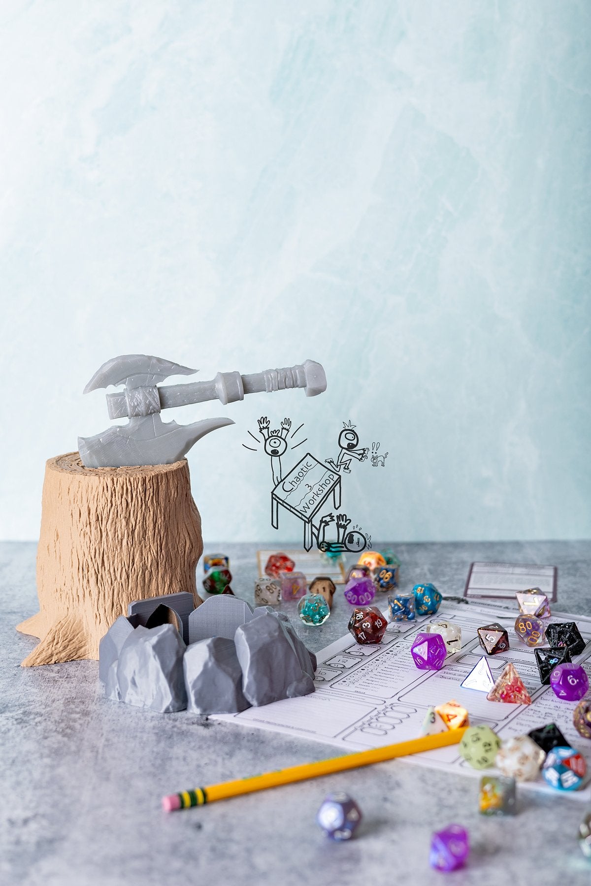 Unit price perThe lonely axe sits waiting, a forgotten relic of a barbarian long past their adventuring day. The dice tower will arrive unprimed and unpainted in the filament color of your choice. The axe on the top will be printed in gray resin. The 100% size is made to fit a standard 16mm die. For larger dice the 120% size should suit your needs.