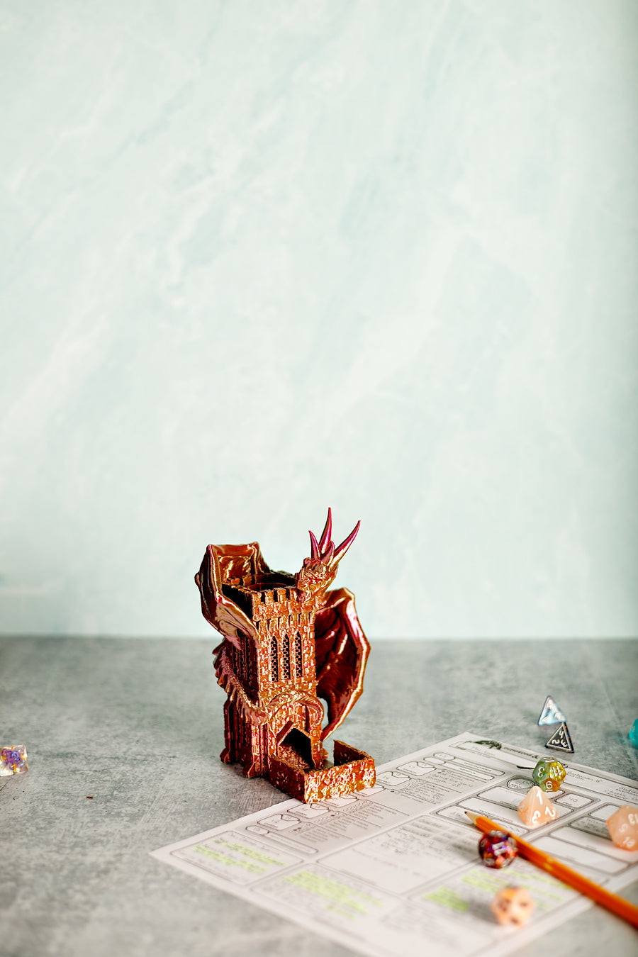 Looking for a tiny and easy to transport tower? This Wyvern tower is a perfect option! The dice tower will arrive unprimed and unpainted in the filament color of your choice. The 100% size is made to fit a standard 16mm die. For larger dice the 130% size should suit your needs. Choose the tray option that best suits your personal style. They are all interchangeable.