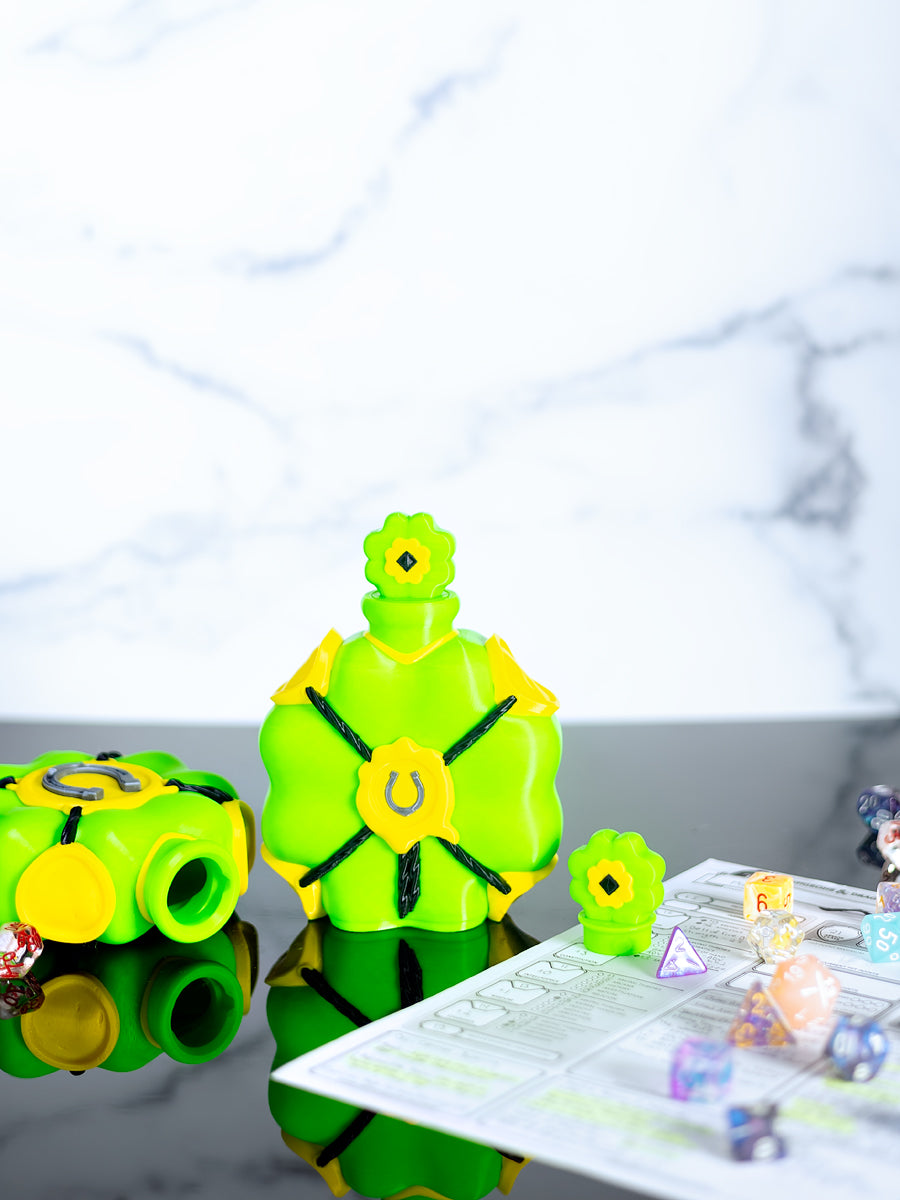 Unit price perThis potion of luck will give you a (literal) roll of the dice! With its lucky four-leaf clover and coin details, you'll be sure to win big. And with its screw top, it's not only practical for storing dice, but also for keeping your luck, and anything else you want to stash, in place. Good luck (pun intended) charm in a bottle. The potion bottle will arrive unprimed and unpainted in the filament color of your choice.